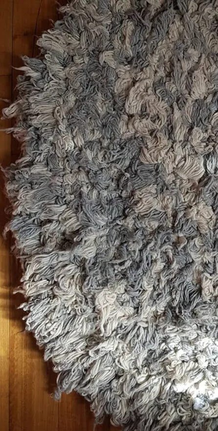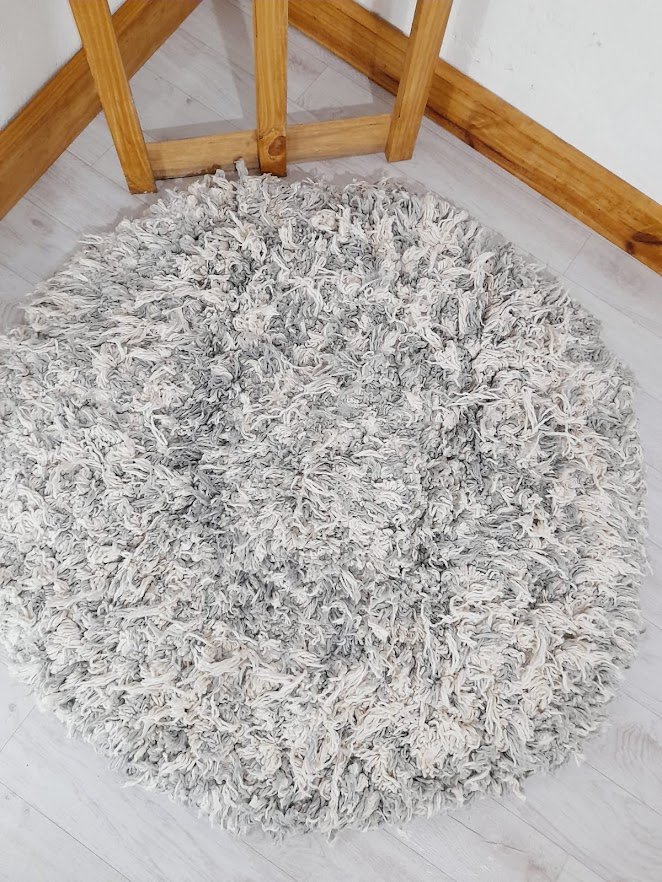 Alfombra Nórdica Artesanal Redonda 1.10 metro. Tejida a mano 100% artesanal. Pelo Grueso. Color Crudo y Gris claro combinado.