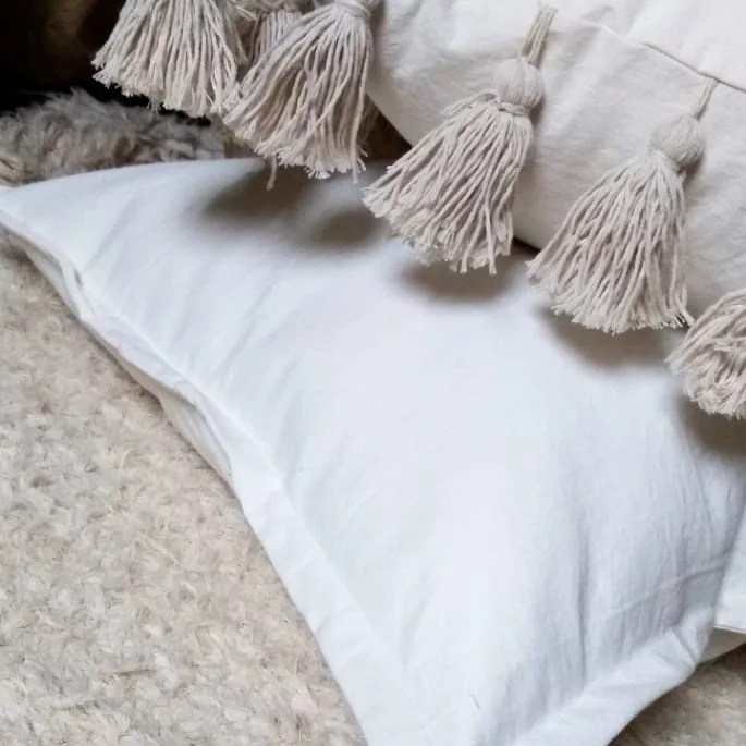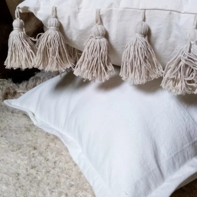 Almohadón Decorativo de tusor con borlas en los laterales confeccionadas a mano con hilo de algodón.